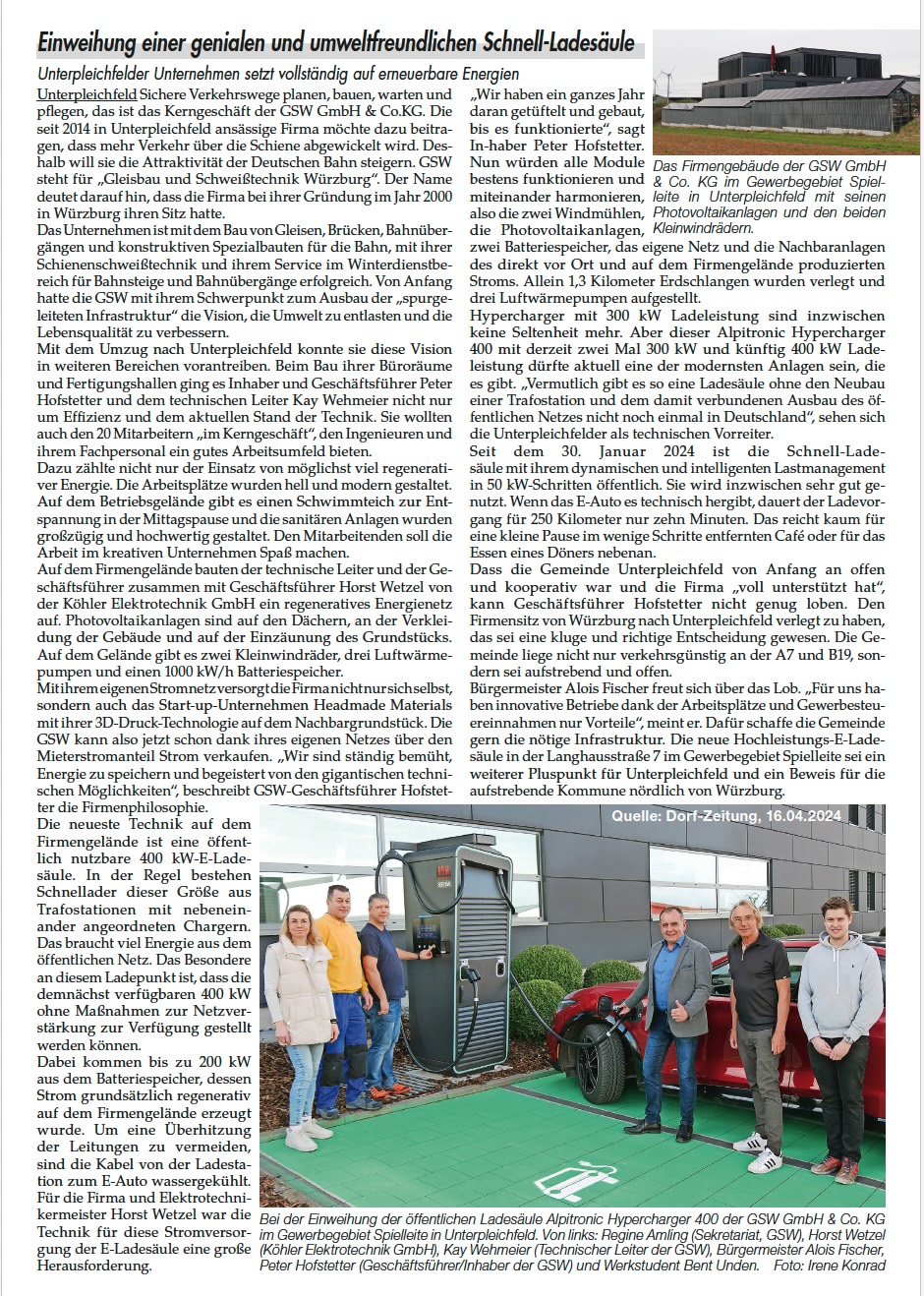 Artikel zur Einweihung der öffentlichen Ladesäule der GSW GmbH & Co. KG am Firmengelände in Unterpleichfeld.